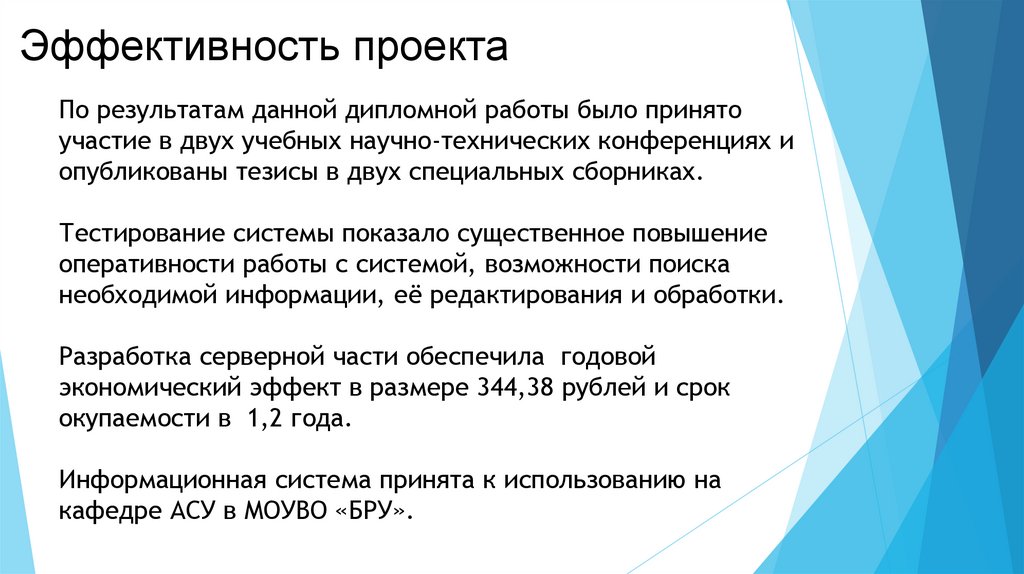 Эффективность проектаПо результатам данной дипломной работы было принято