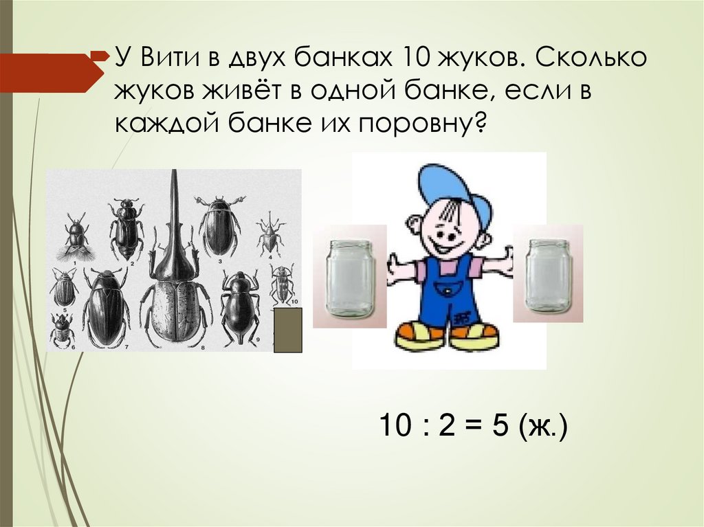 У Вити в двух банках 10 жуков. Сколькожуков живёт в одной банке, если в