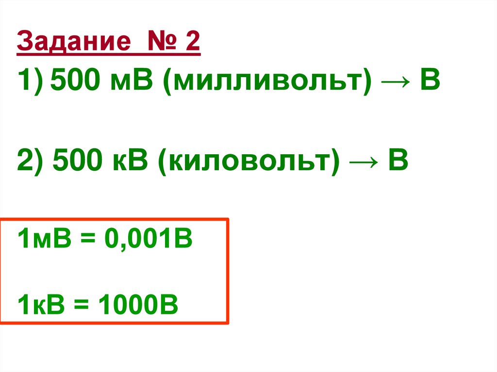1) 500 мВ (милливольт) → В