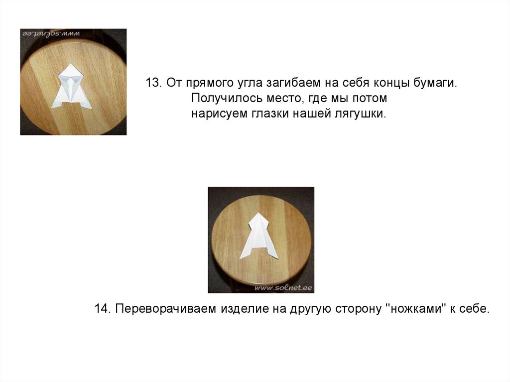 13. От прямого угла загибаем на себя концы бумаги.Получилось место, где мы потом