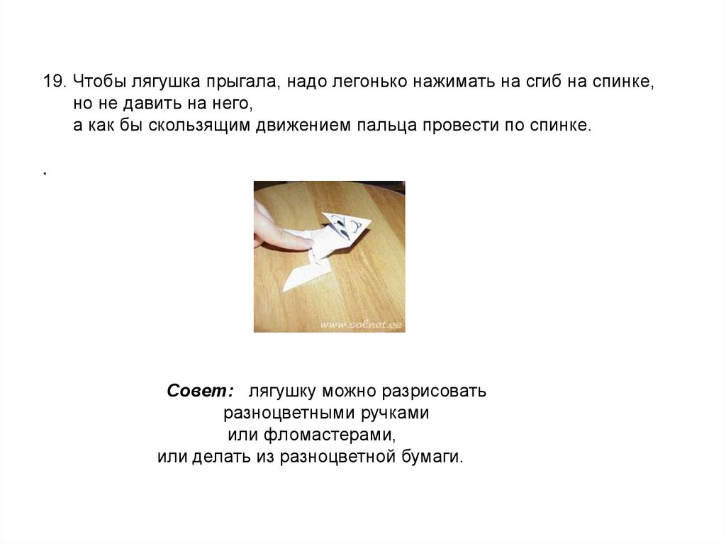 19. Чтобы лягушка прыгала, надо легонько нажимать на сгиб на спинке,но не давить на него,
