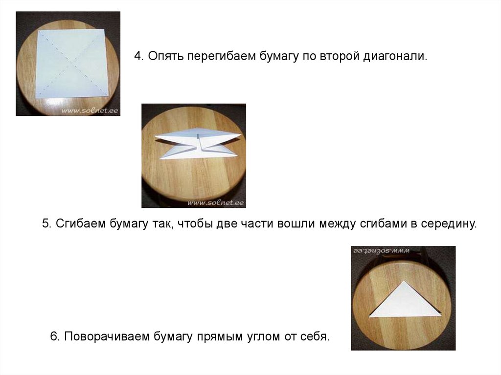 4. Опять перегибаем бумагу по второй диагонали.5. Сгибаем бумагу так, чтобы две части вошли между сгибами в середину.