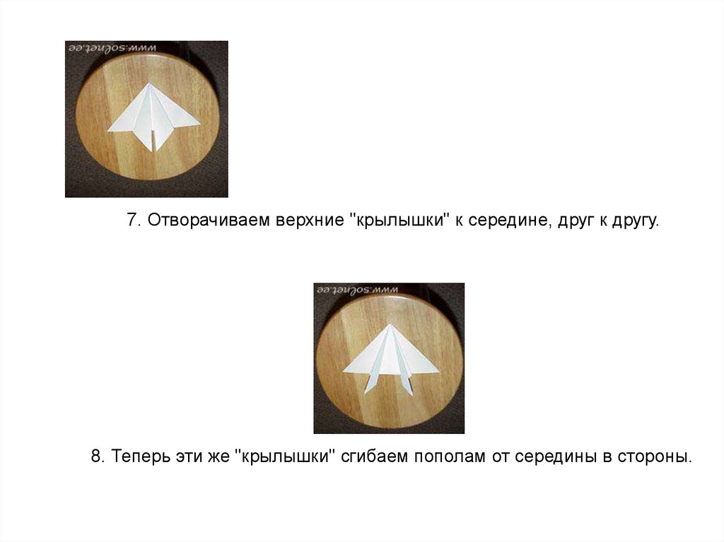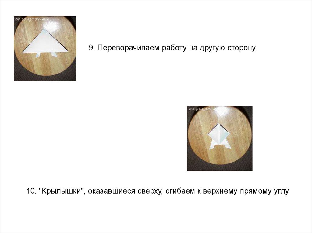7. Отворачиваем верхние "крылышки" к середине, друг к другу.8. Теперь эти же "крылышки" сгибаем пополам от середины в стороны.
