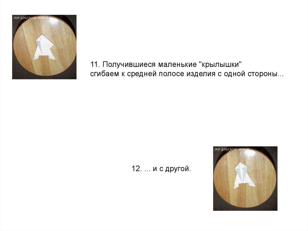 11. Получившиеся маленькие "крылышки"сгибаем к средней полосе изделия с одной стороны...