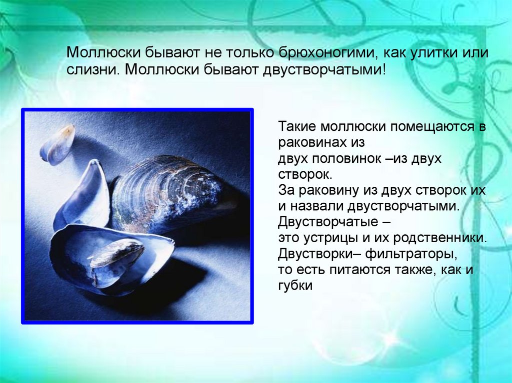 Моллюски бывают не только брюхоногими, как улитки илислизни. Моллюски бывают двустворчатыми!