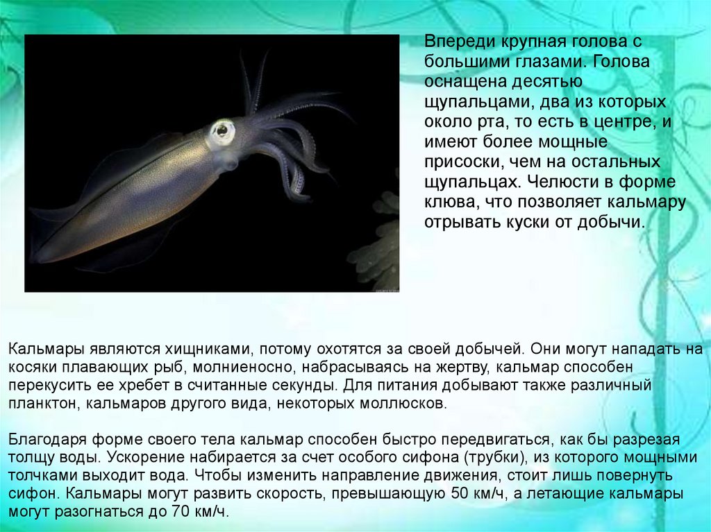сифон. Кальмары могут развить скорость, превышающую 50 км/ч, а летающие кальмары