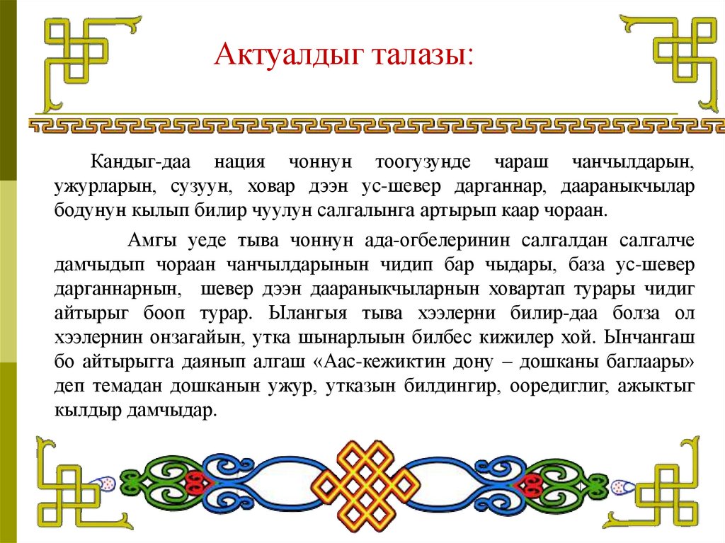 Актуалдыг талазы:Кандыг-даа нация чоннун тоогузунде чараш чанчылдарын,