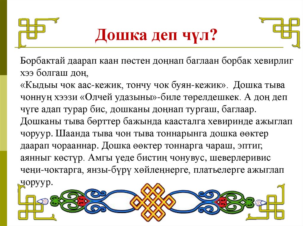 «Кыдыы чок аас-кежик, тончу чок буян-кежик». Дошка тыва
