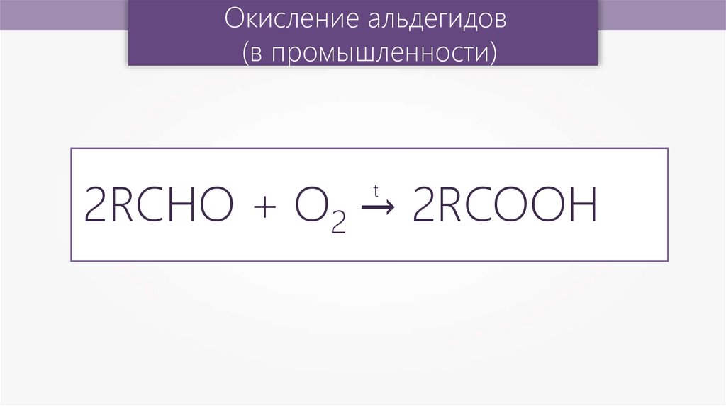Окисление альдегидов (в промышленности) 2RCHO + О2 → 2RCOOH