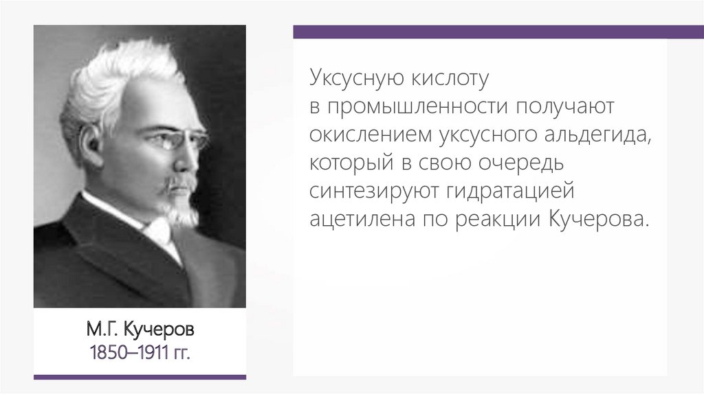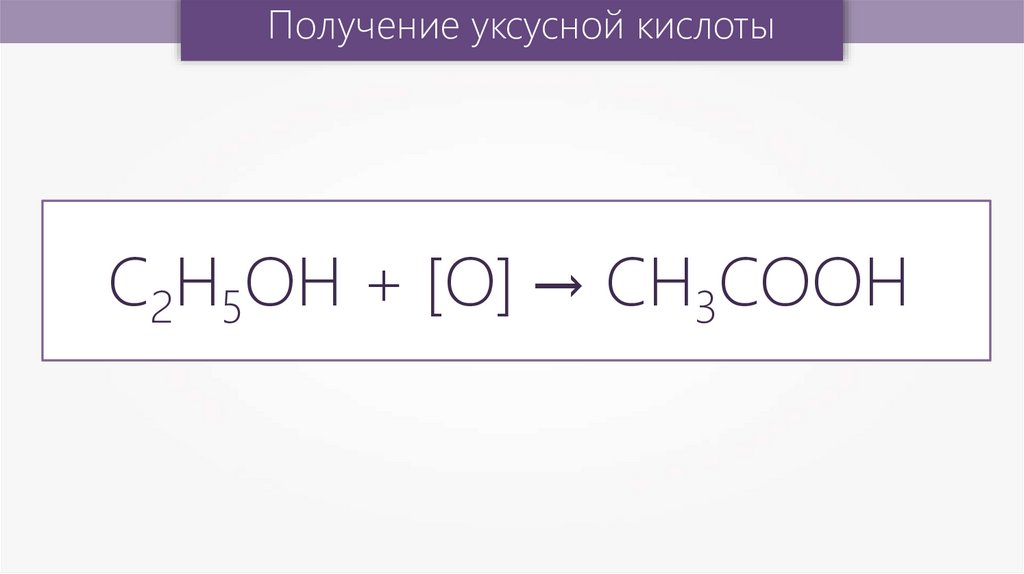 Получение уксусной кислотыC2H5OН + [О] → CH3COOH