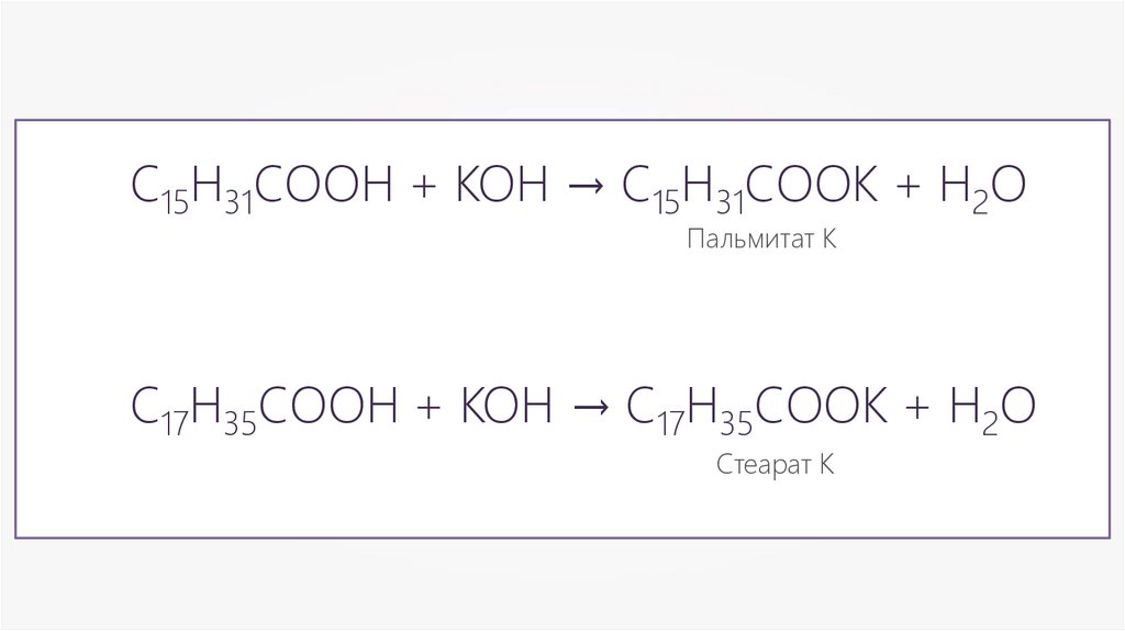 С17Н35СООН + КОН → С17Н35СООК + Н2О