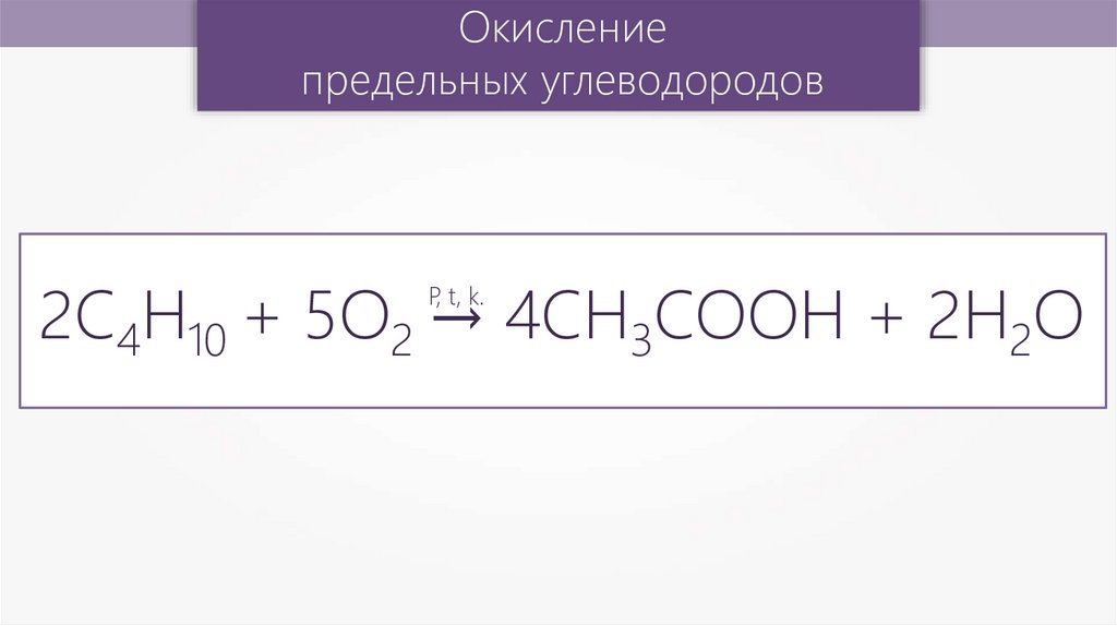 2C4H10 + 5О2 → 4CH3COOH + 2H2O