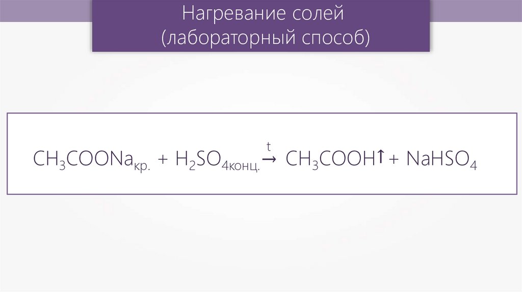 CH3COONaкр. + H2SO4конц.→ CH3COOH + NaHSO4
