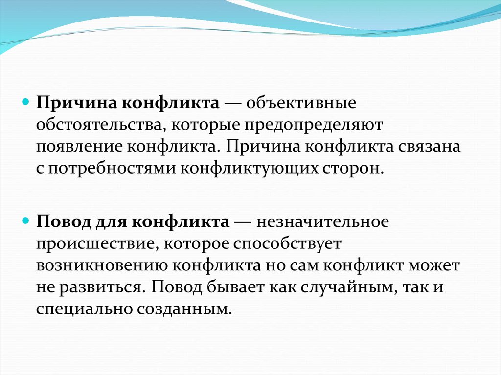 Причина конфликта — объективныеобстоятельства, которые предопределяют