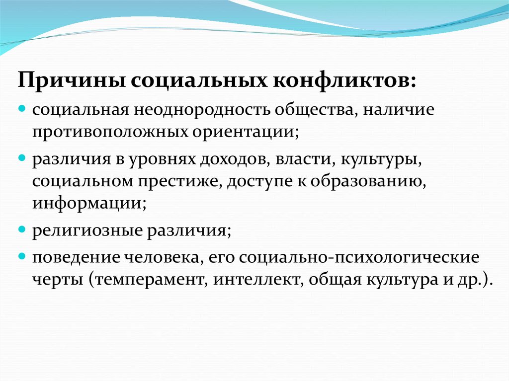 Причины социальных конфликтов:социальная неоднородность общества, наличие