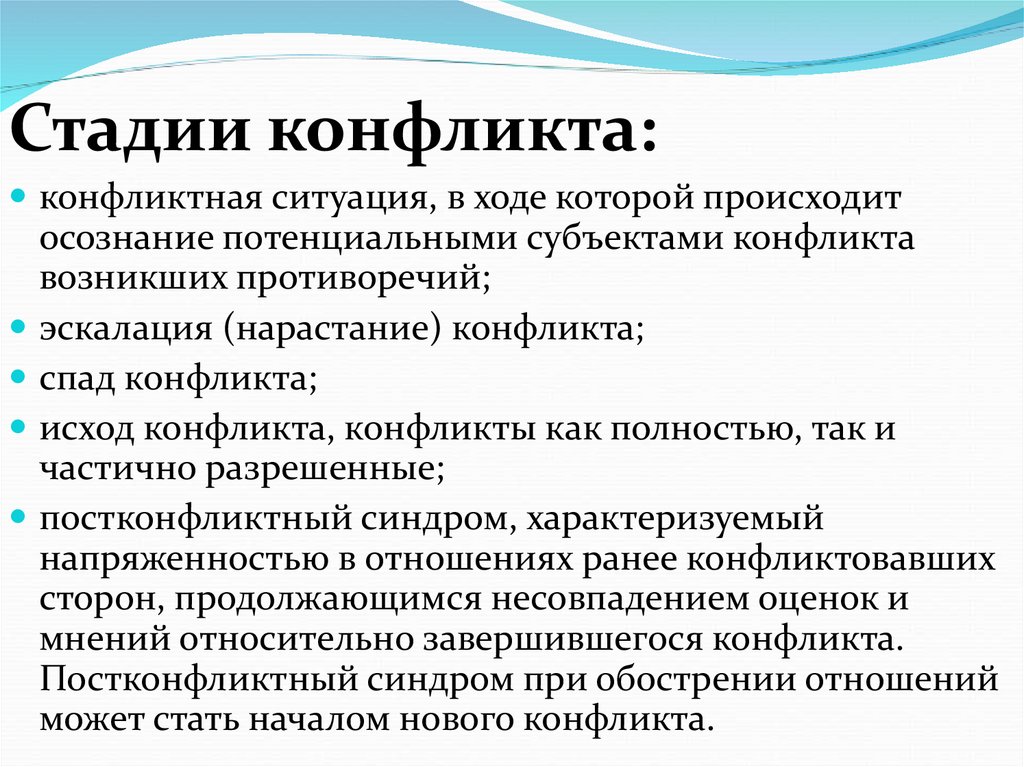 Стадии конфликта:конфликтная ситуация, в ходе которой происходит