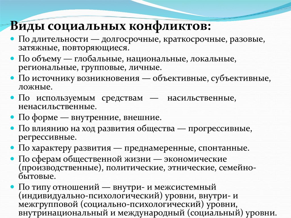Виды социальных конфликтов:По длительности — долгосрочные, краткосрочные, разовые,