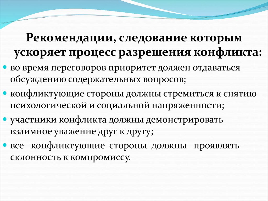 Рекомендации, следование которымускоряет процесс разрешения конфликта: