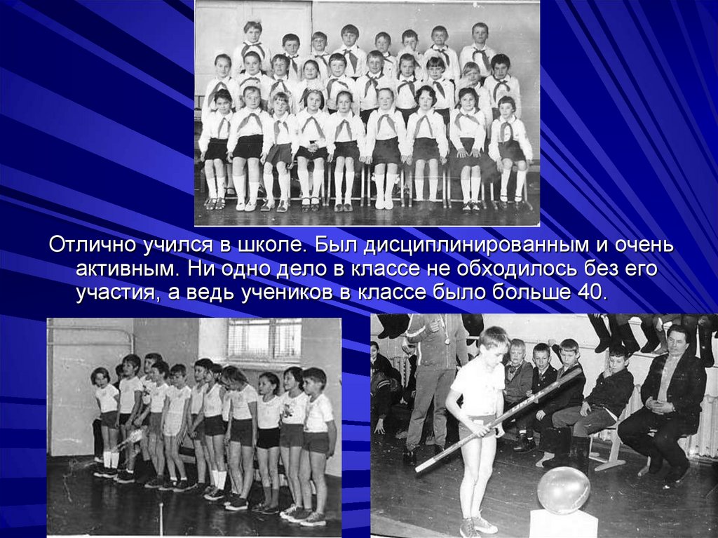 Отлично учился в школе. Был дисциплинированным и оченьактивным. Ни одно дело в классе не обходилось без его