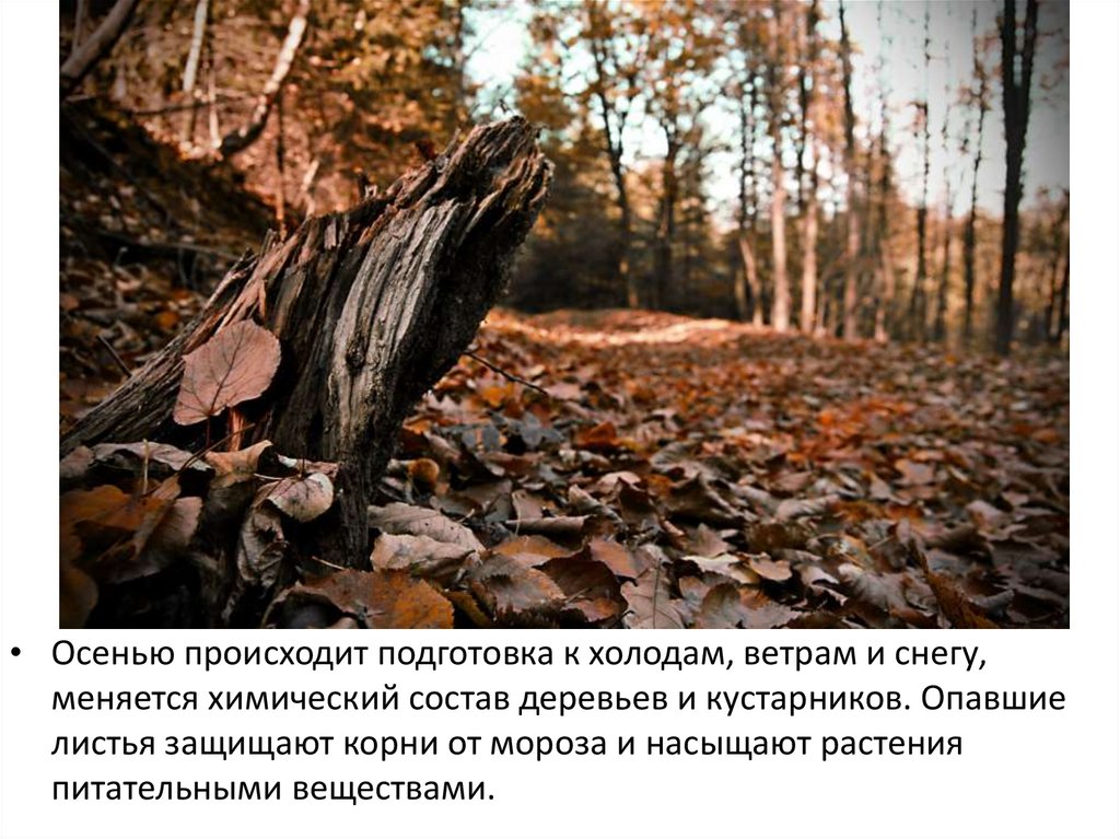 • Осенью происходит подготовка к холодам, ветрам и снегу,меняется химический состав деревьев и кустарников. Опавшие