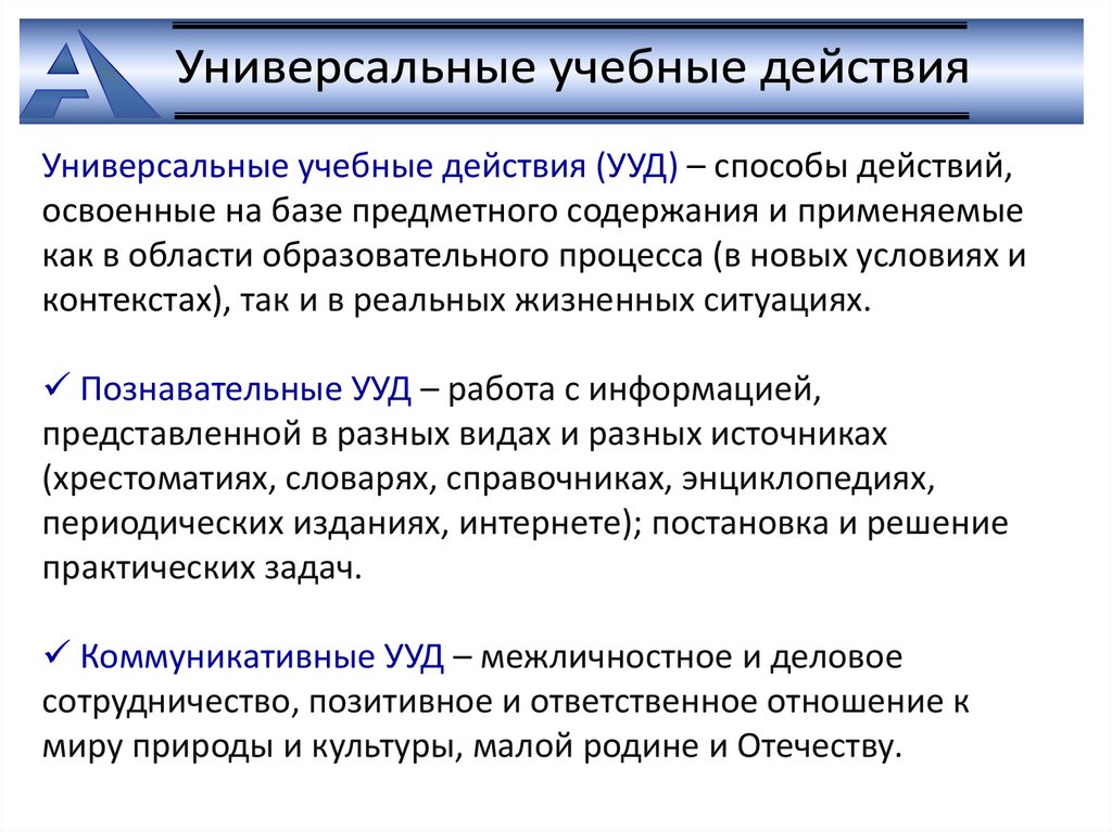 Универсальные учебные действия (УУД) – способы действий,освоенные на базе предметного содержания и применяемые