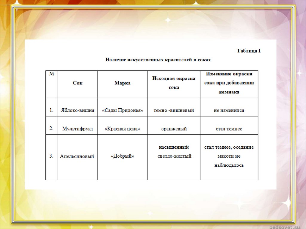 10. Опыт 1. «Определение искусственного красителя в соках»