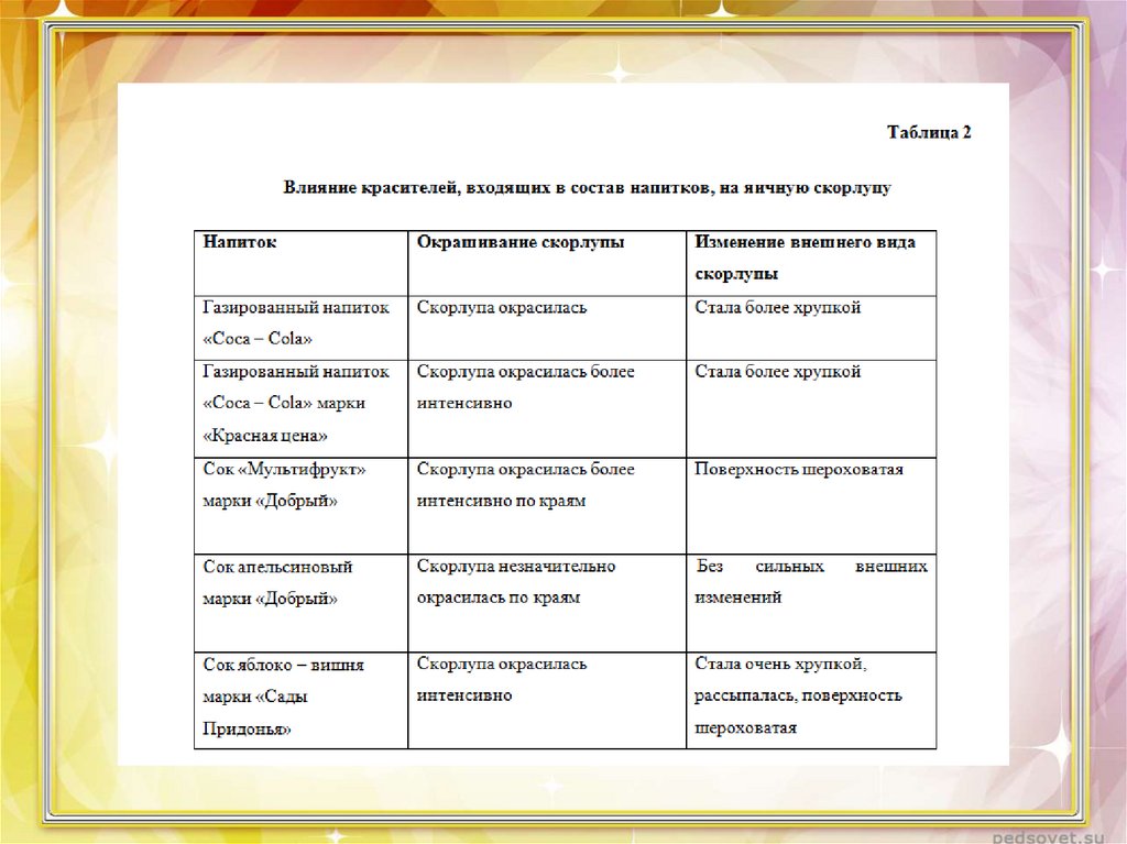 13. Опыт 3. «Влияние красителей, входящих в состав напитков, на яичную скорлупу»