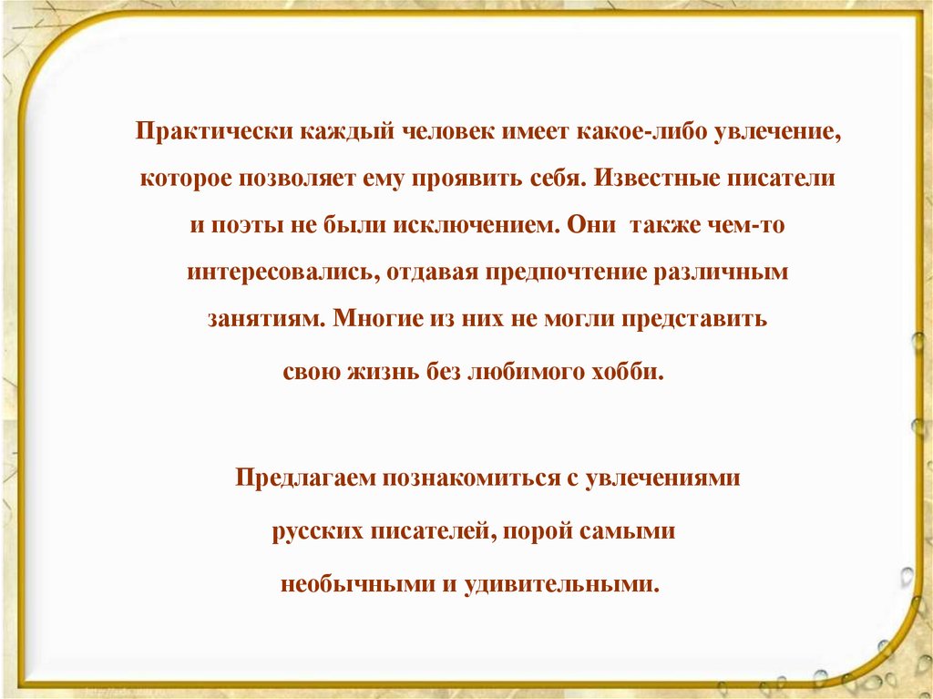 Практически каждый человек имеет какое-либо увлечение,которое позволяет ему проявить себя. Известные писатели