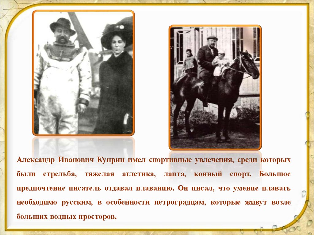 Александр Иванович Куприн имел спортивные увлечения, среди которыхбыли стрельба, тяжелая атлетика, лапта, конный спорт. Большое