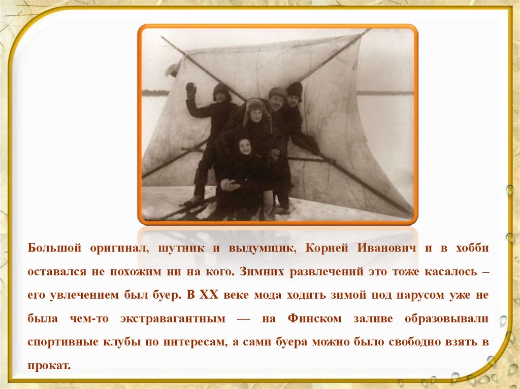 Большой оригинал, шутник и выдумщик, Корней Иванович и в хоббиоставался не похожим ни на кого. Зимних развлечений это тоже касалось –