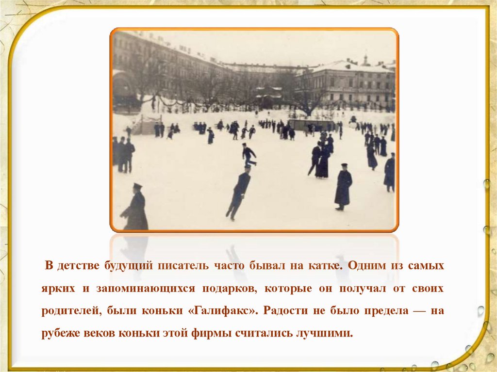 В детстве будущий писатель часто бывал на катке. Одним из самыхярких и запоминающихся подарков, которые он получал от своих