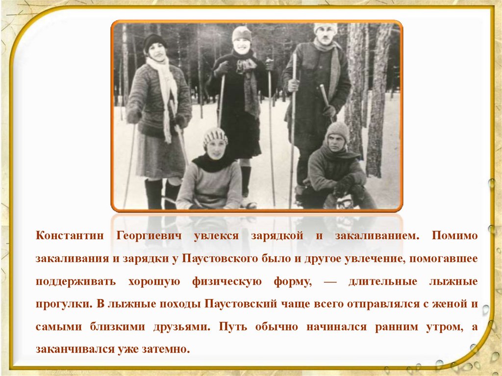 Константин Георгиевич увлекся зарядкой и закаливанием. Помимозакаливания и зарядки у Паустовского было и другое увлечение, помогавшее