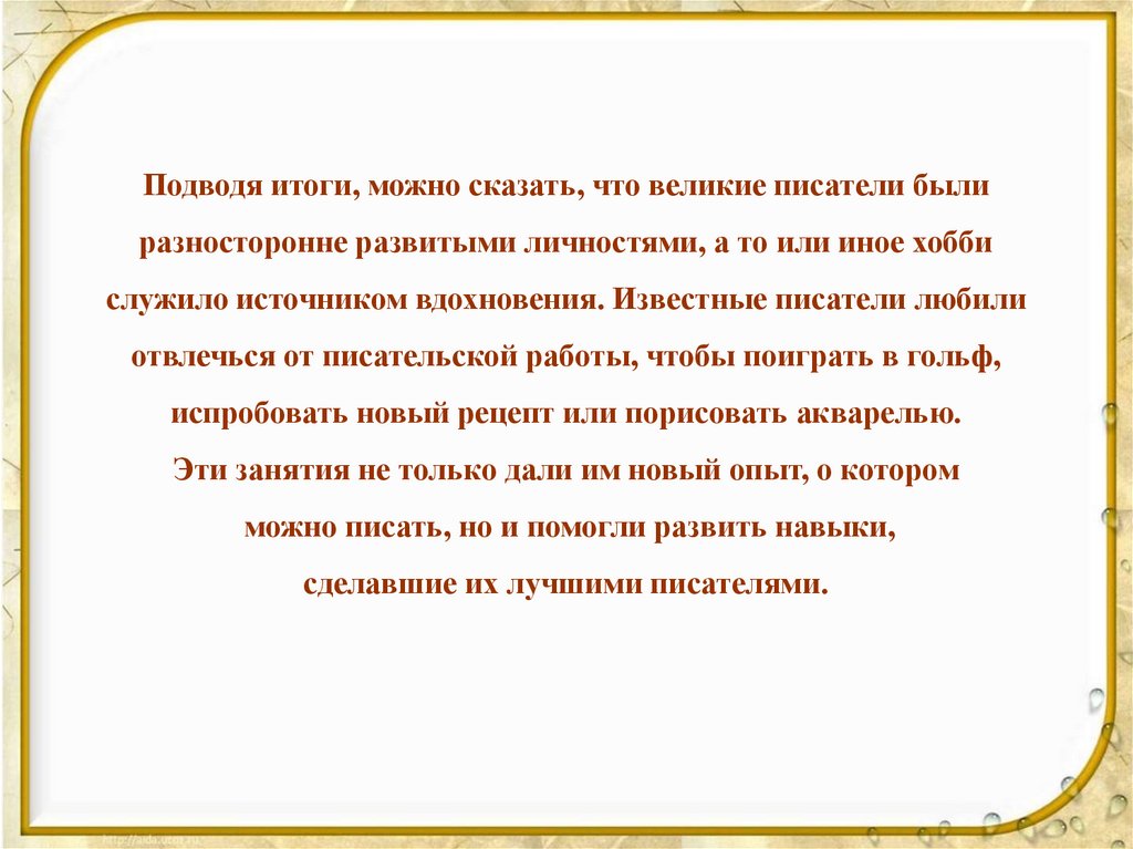 Подводя итоги, можно сказать, что великие писатели былиразносторонне развитыми личностями, а то или иное хобби