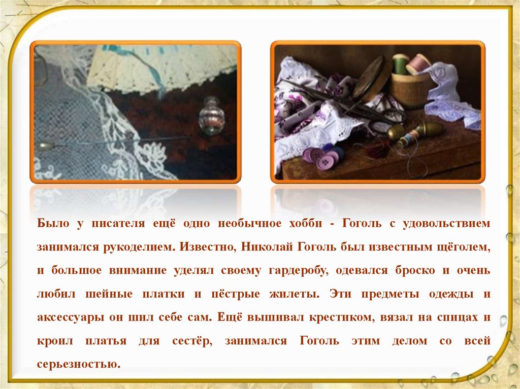 Было у писателя ещё одно необычное хобби - Гоголь с удовольствиемзанимался рукоделием. Известно, Николай Гоголь был известным щёголем,