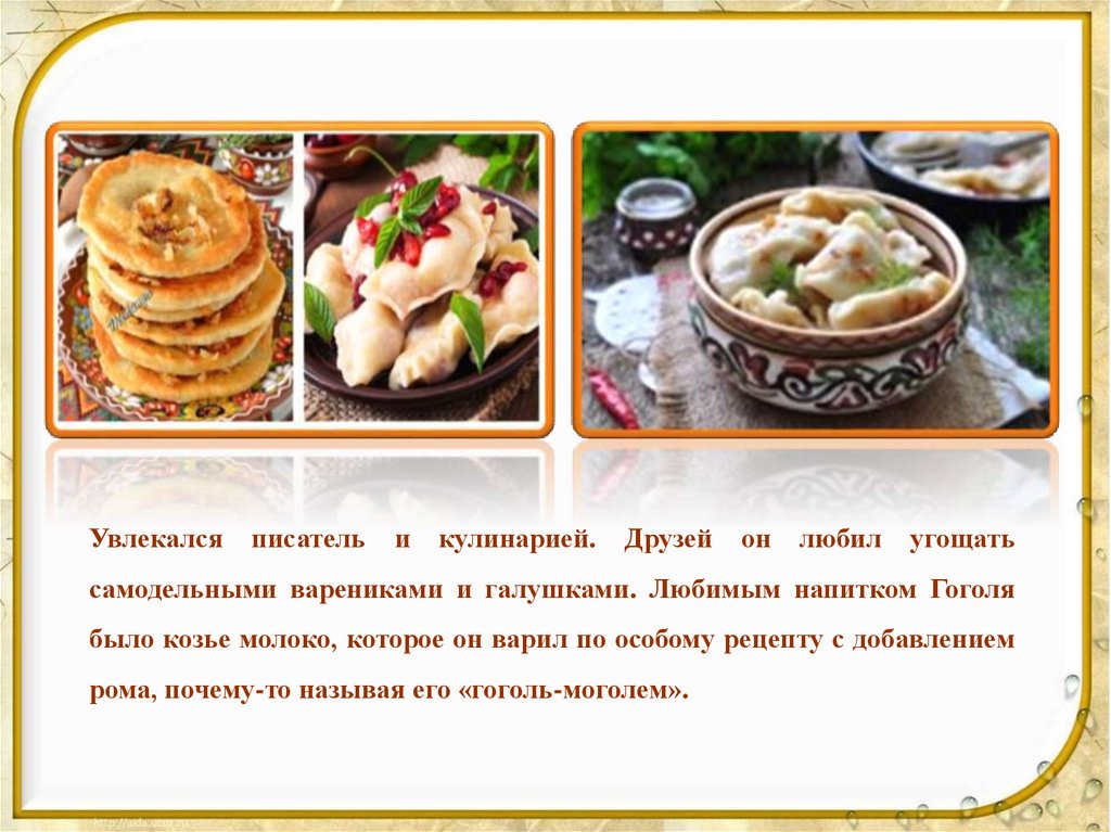 самодельными варениками и галушками. Любимым напитком Гоголя