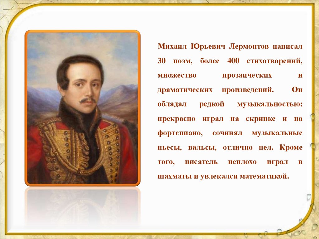 Михаил Юрьевич Лермонтов написал30 поэм, более 400 стихотворений,