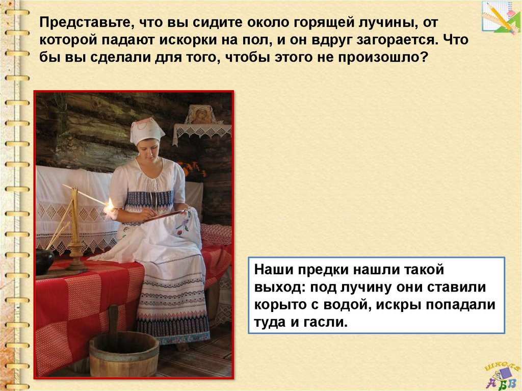Представьте, что вы сидите около горящей лучины, откоторой падают искорки на пол, и он вдруг загорается. Что