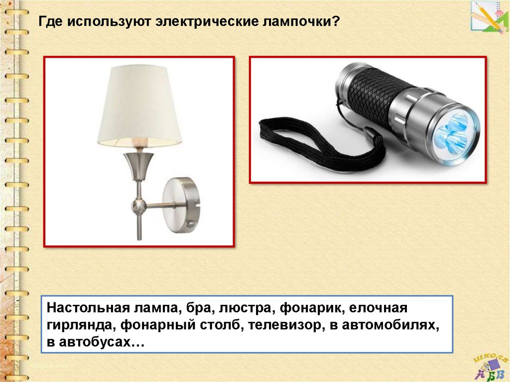 Где используют электрические лампочки?Настольная лампа, бра, люстра, фонарик, елочная