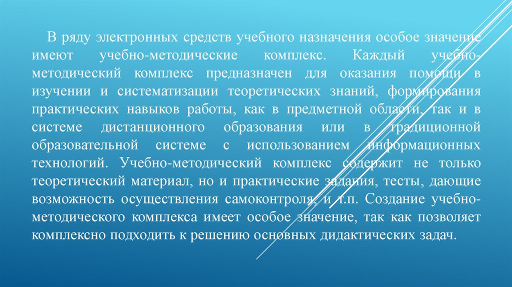 возможность осуществления самоконтроля, и т.п. Создание учебнометодического комплекса имеет особое значение, так как позволяет