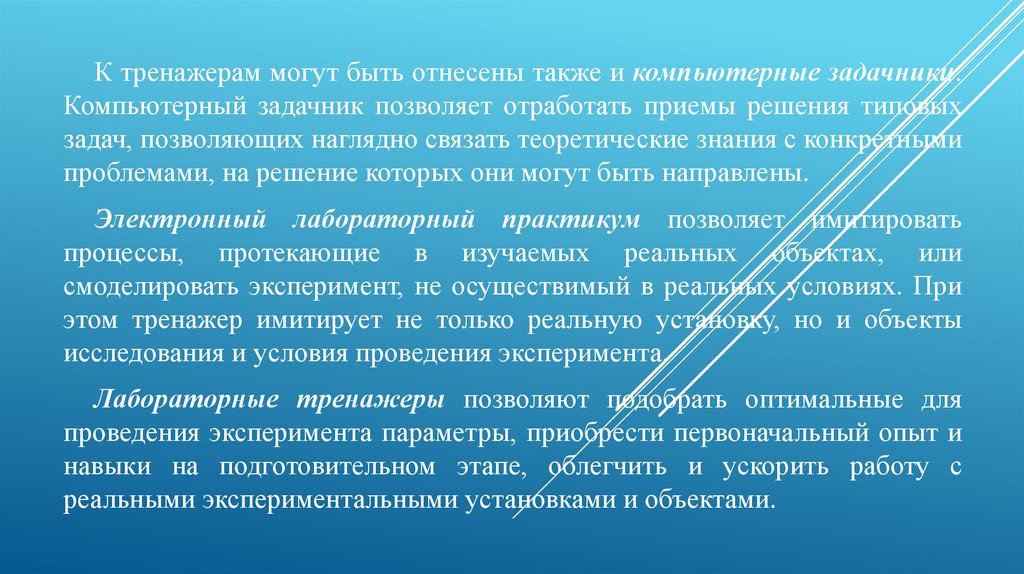 К тренажерам могут быть отнесены также и компьютерные задачники.Компьютерный задачник позволяет отработать приемы решения типовых