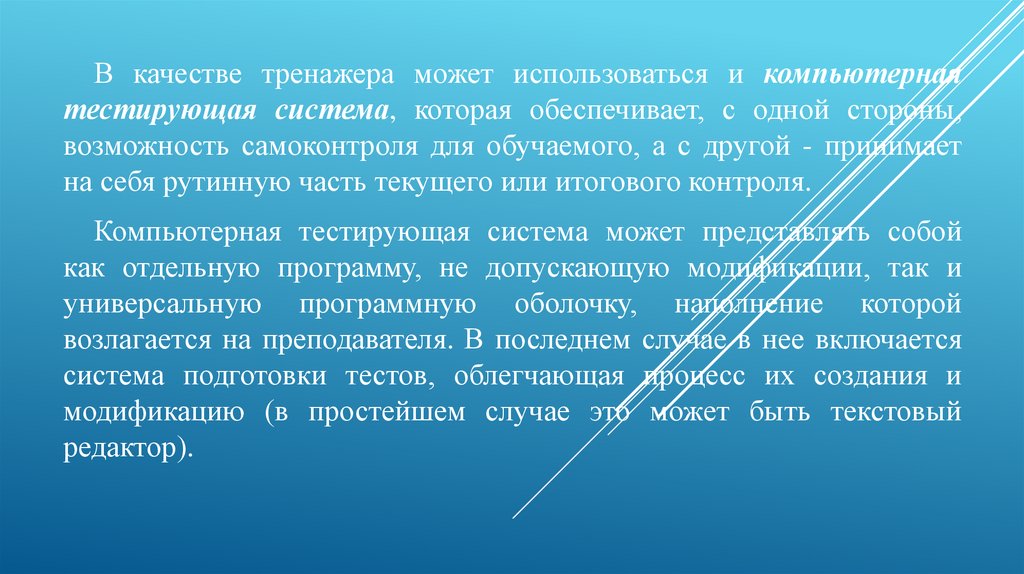 В качестве тренажера может использоваться и компьютернаятестирующая система, которая обеспечивает, с одной стороны,