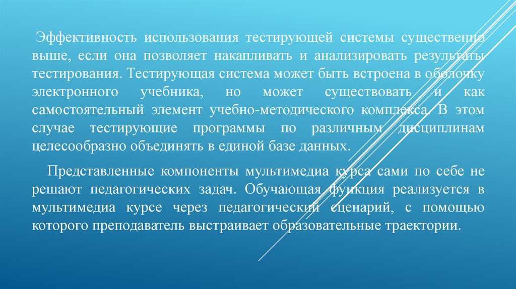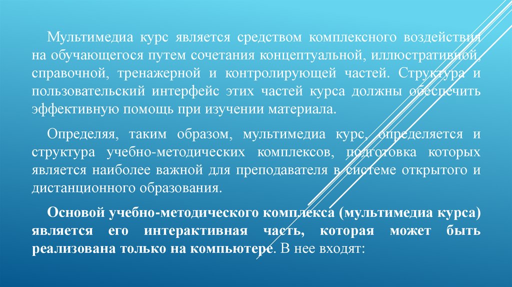 Мультимедиа курс является средством комплексного воздействияна обучающегося путем сочетания концептуальной, иллюстративной,