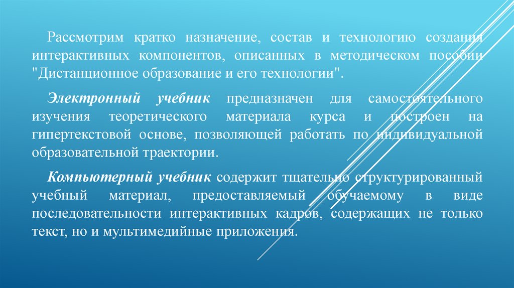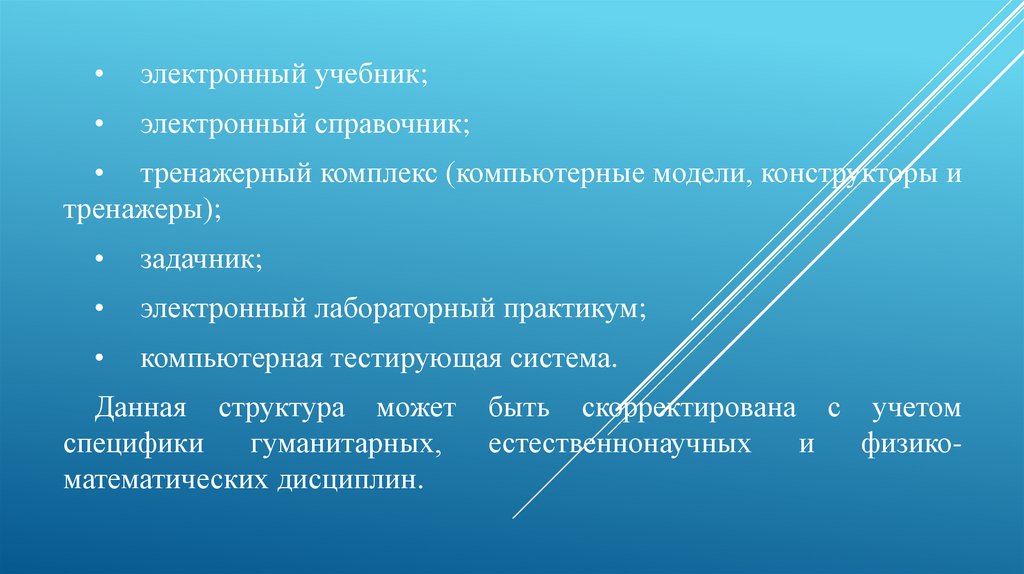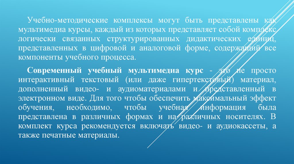 Учебно-методические комплексы могут быть представлены какмультимедиа курсы, каждый из которых представляет собой комплекс