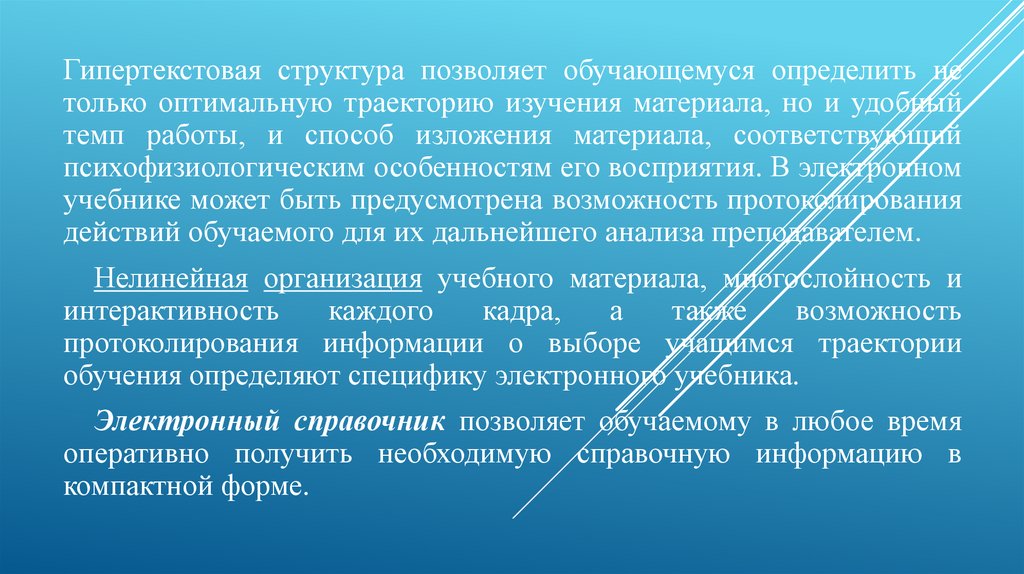 Гипертекстовая структура позволяет обучающемуся определить нетолько оптимальную траекторию изучения материала, но и удобный
