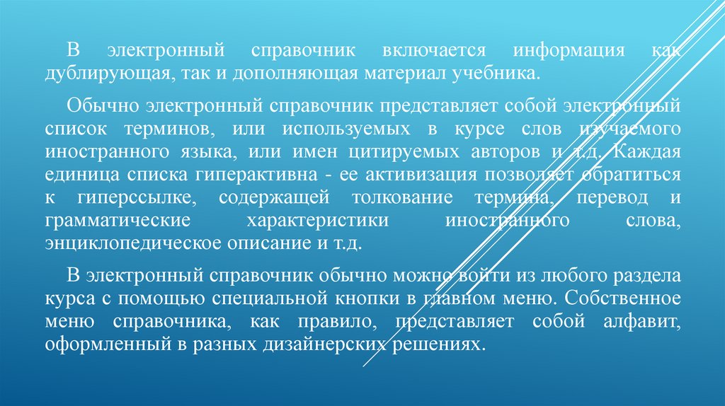 В электронный справочник включается информациядублирующая, так и дополняющая материал учебника.