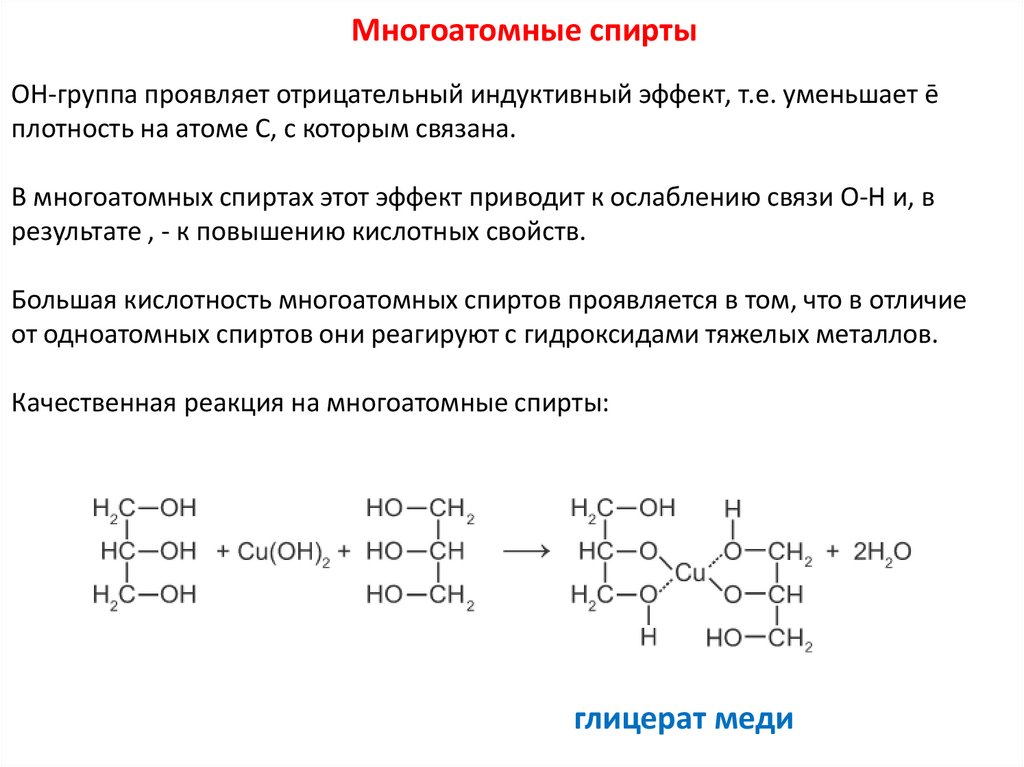 от одноатомных спиртов они реагируют с гидроксидами тяжелых металлов.