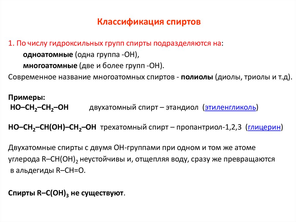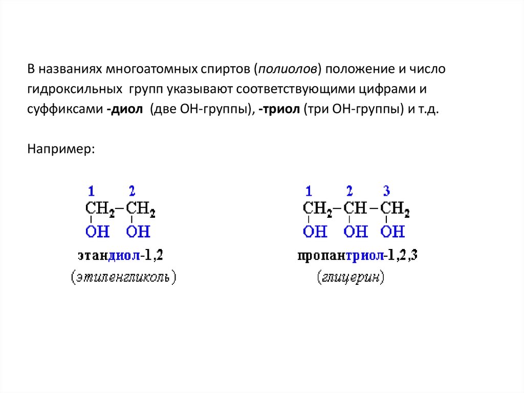 суффиксами -диол (две ОН-группы), -триол (три ОН-группы) и т.д.