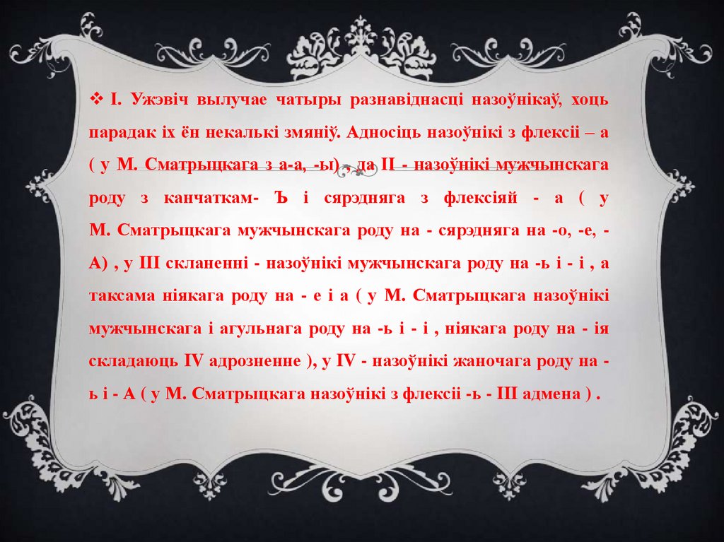 М. Сматрыцкага мужчынскага роду на - сярэдняга на -о, -е, А) , у III скланенні - назоўнікі мужчынскага роду на -ь і - і , а