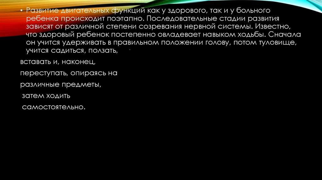 • Развитие двигательных функций как у здорового, так и у больногоребенка происходит поэтапно. Последовательные стадии развития