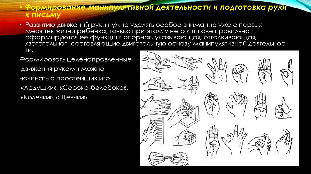 • Развитию движений руки нужно уделять особое внимание уже с первых